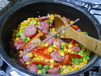 Depois adicione o arroz, o milho verde escorrido e a ervilha.